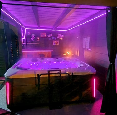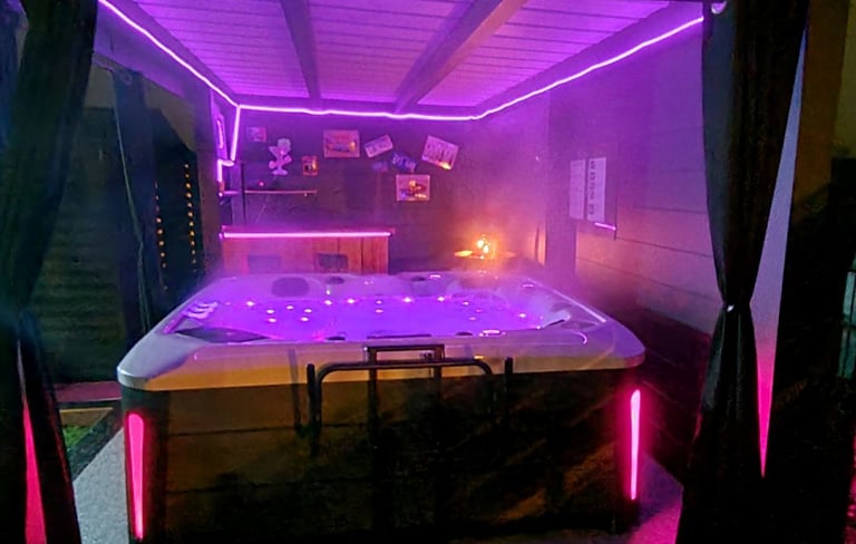 ✅ Accès à notre spa extérieur chauffé (précision : l'utilisation aux enfants de moins de 5 ans est interdit car cela peut entraîner un risque d'hyperthermie), avec espace détente et bar