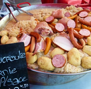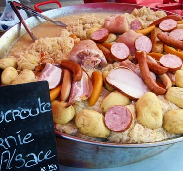 Laissez-vous tenter par les délices de la cuisine alsacienne : les célèbres tartes flambées, la généreuse choucroute et le traditionnel baeckeoffe.