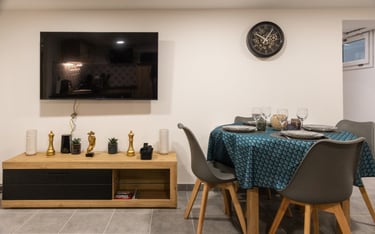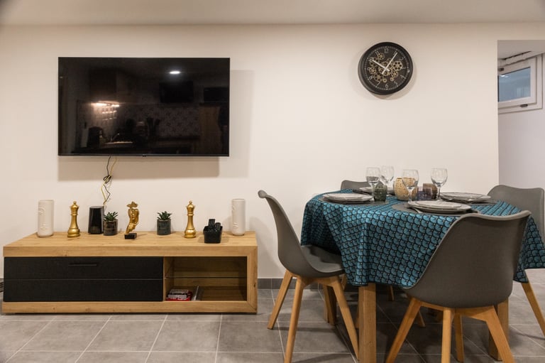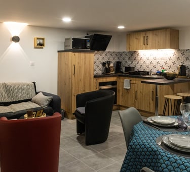 Salon cosy et salle à manger (table pour 4 personnes, possibilité d’ajouter 2 chaises)